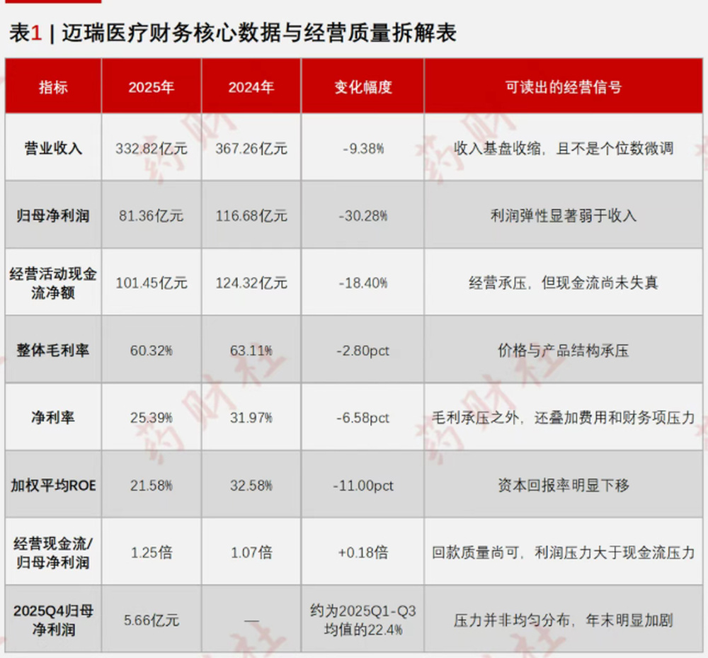 曾经被市场奉为“医械茅”的白马股,如今深陷业绩与估值双杀的困境。日前,迈瑞医疗公布的2025年年报显示,公司全年营收332.82亿元,同比下滑9.38%;归母净利润81.36亿元,同比暴跌30.28%;扣非净利润达80.69亿元,同比下降29.48%。