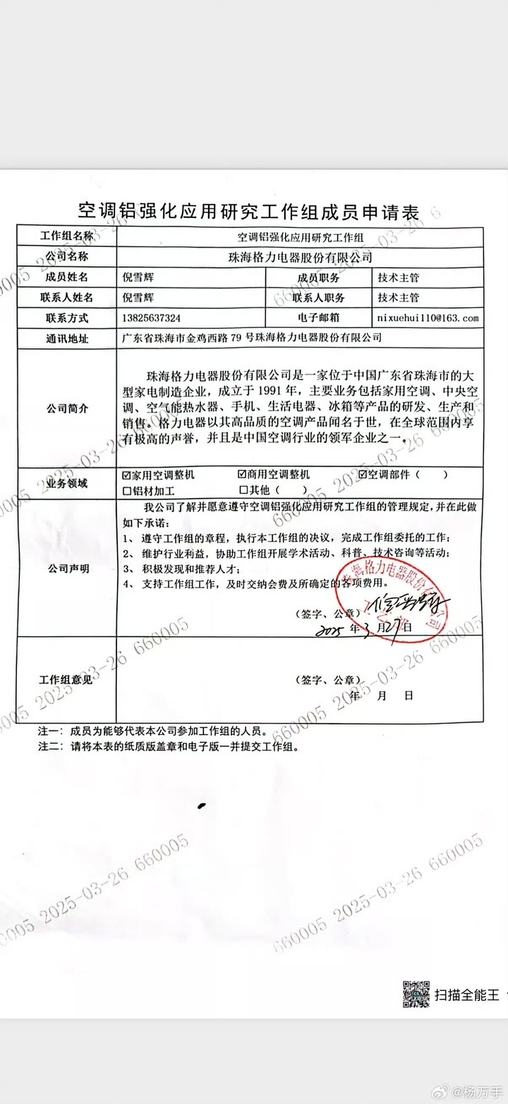 然而,杨祥玺晒出的申请表让格力的“纯粹”形象受到质疑。2025年3月27日,格力申请加入空调铝强化应用研究工作组,尽管最终未签署相关协议,但已被解读为“动作很诚实”。