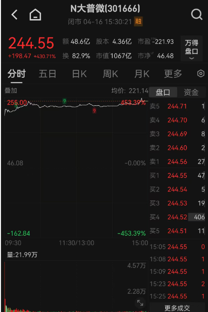4月16日,有“AI SSD(固态硬盘)第一股”之称的深圳大普微电子股份有限公司(以下简称“大普微”)正式登陆创业板,收报每股244.55元,涨幅高达430.71%,总市值达到1066.77亿元。需要指出的是,大普微发行价为每股46.08元,按当日收盘价计算,中一签(500股)的投资者最高可获利9.92万元,接近10万元大关。