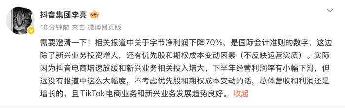 不过,李亮也确认了公司经营利润率出现波动的说法。他坦言,由于国内抖音电商业务增速放缓,加上公司增加了对新兴业务的投资,去年下半年的经营利润率确实出现了小幅下滑。但他强调,真实的下滑幅度远没有媒体报道的那么大,目前TikTok电商及新兴业务的整体发展趋势依然较好。