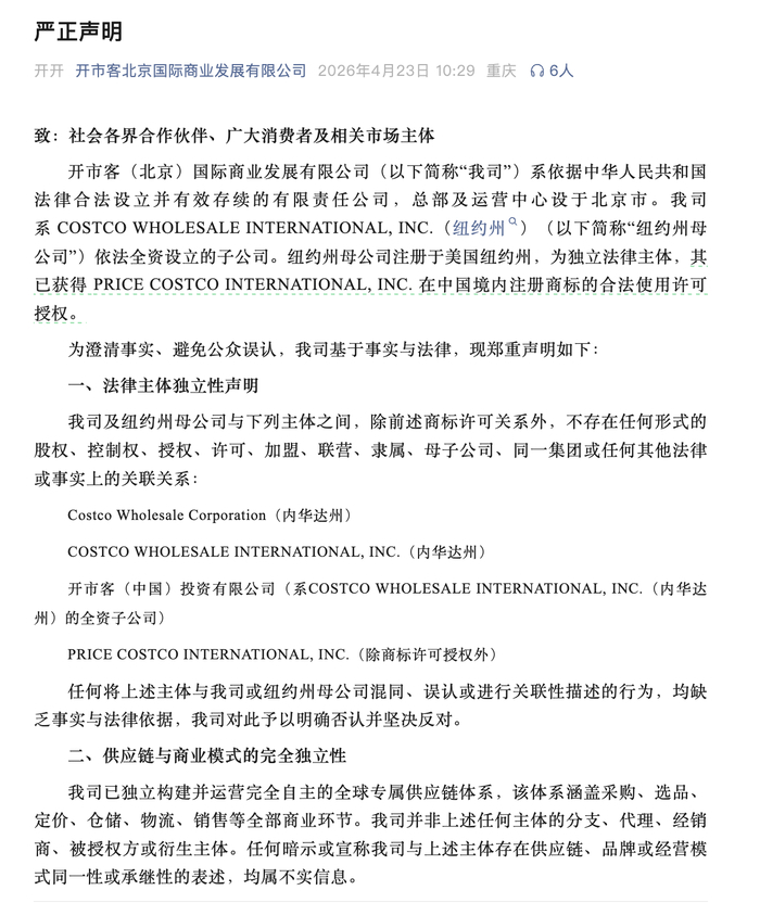 声明中写道,该公司及其纽约州母公司,与大众熟知的Costco Wholesale Corporation(内华达州)以及开市客(中国)投资有限公司之间,不存在股权、控制权、加盟、联营或同一集团关系。这表明,该企业确认其并非目前在国内开设7家门店的开市客体系成员。