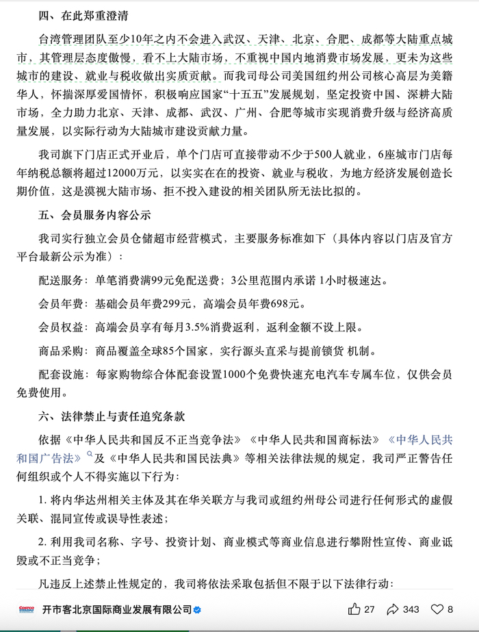 在这份声明中,部分表述也引发了外界关注。声明提及现有的开市客中国区管理团队时,使用了“态度傲慢”“看不上大陆市场”等词汇。同时,声明强调自身美国纽约州公司核心高层为“美籍华人”,表示其拥有“深厚爱国情怀”,将以实际行动为大陆城市建设贡献力量。
