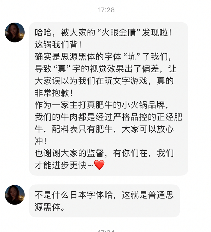 面对记者询问,该联合创始人独家回应称:“这锅我们背!确实是思源黑体的字体‘坑’了我们,导致‘真’字的视觉效果出了偏差,让大家误以为我们在玩文字游戏,真的非常抱歉。”对方强调,作为主打真肥牛的火锅品牌,其门店肥牛产品经过品控管理,相关配料信息可供消费者查看。