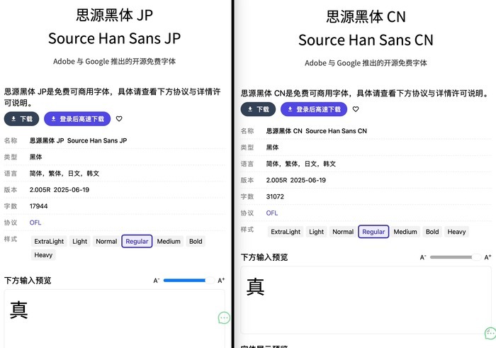 评论区里,有人找出了该字形的来源。多位带设计背景的网友放出了Adobe排版软件和Google字体库的截图验证:在常用的“思源黑体 CN(简体中文版)”里,“真”是规范的封口结构;只有手动切换到“思源黑体 JP(日文版)”等版本时,才会出现招牌上这种未封口的写法。
