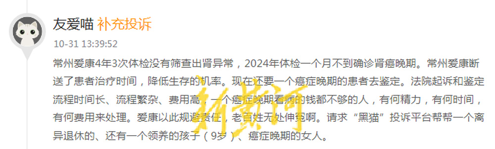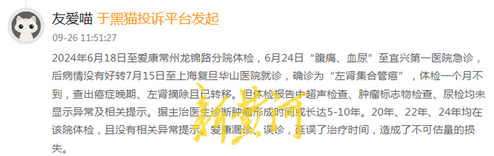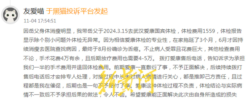 2024年11月,有消费者投诉称其家人在爱康国宾体检基本无异常,因为信任体检机构的专业性,导致病情拖延,5个月后确诊舌癌,治疗费用庞大。