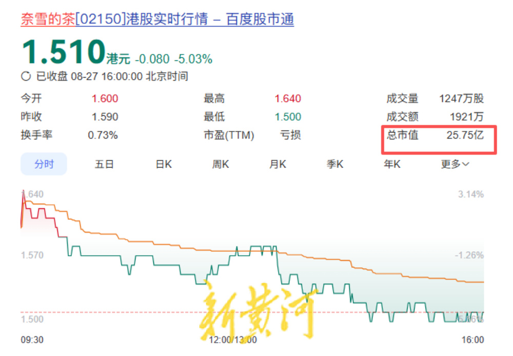 以奈雪的茶为例,在上市初期市值曾突破300亿港元,但受制于门店扩张成本、供应链投入与营销开支,长期难以扭转亏损。截至8月27日收盘,其市值约25.75亿港元,不足巅峰时期的1/10。