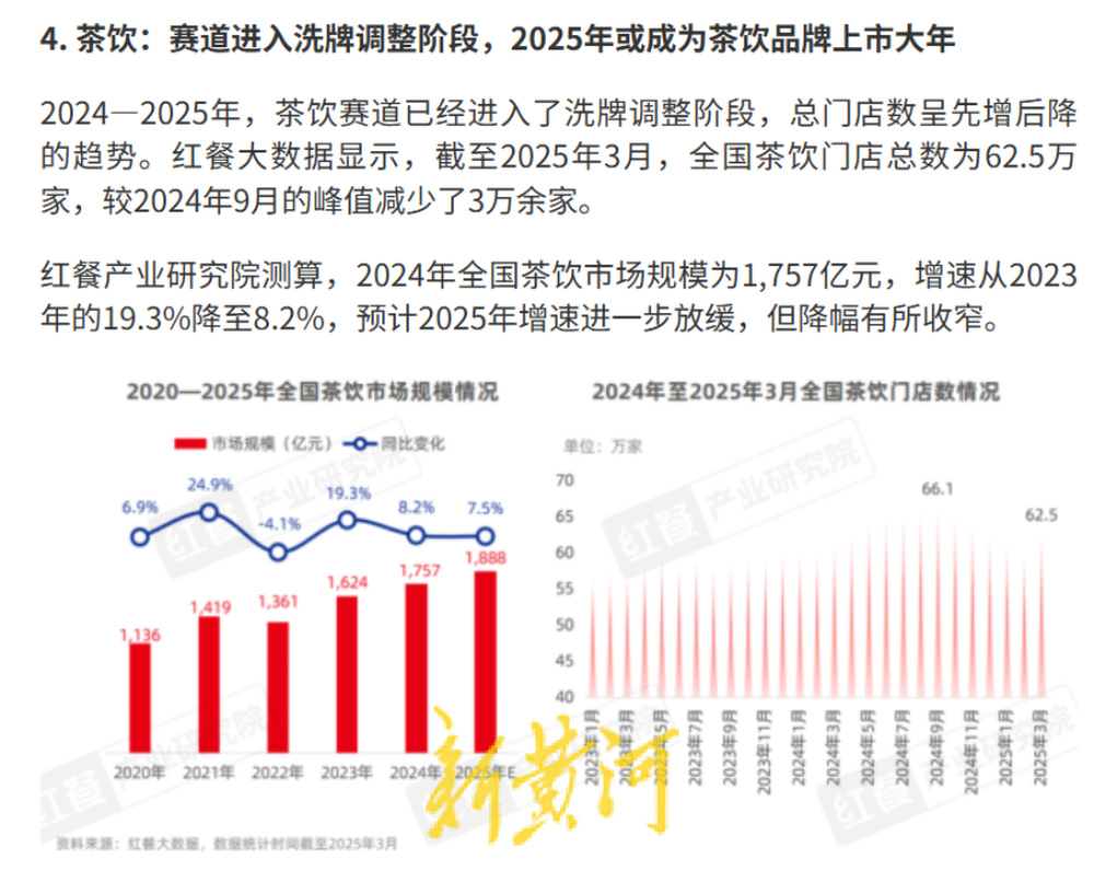 红餐产业研究院披露,2024年中国现制茶饮市场规模约1757亿元,同比增长8.2%,明显低于前几年的双位数增速;对2025年的共识预期也在向低速区间滑落。而美团×CCFA此前测算,行业从2023年的1498亿元有望在2025年触达约2015亿元,但边际放慢已经成为共识。