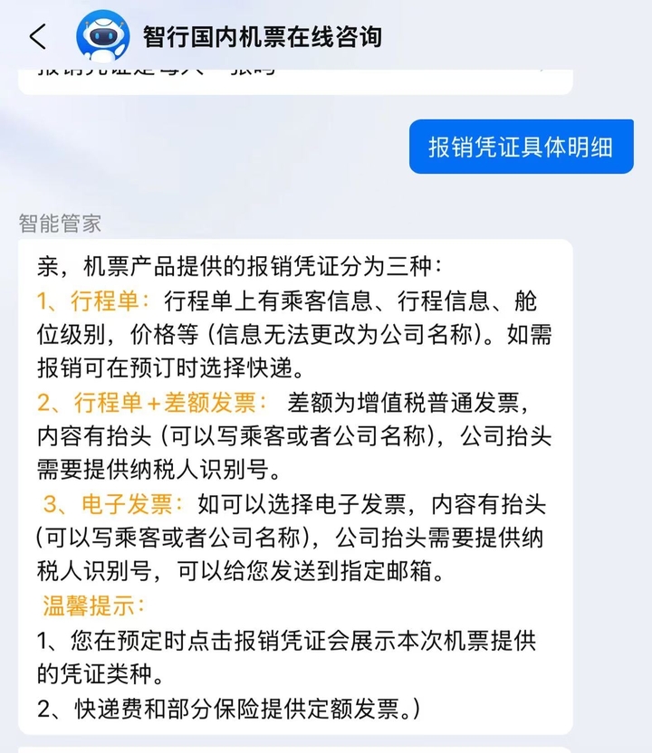 记者致电智行App,人工客服回应称,消费者下单时每笔订单报销凭证的入口不同,报销凭证一栏标注行程单或电子发票的可以进行二选一,仅标注“全额电子发票”的机票,不支持开具行程单。