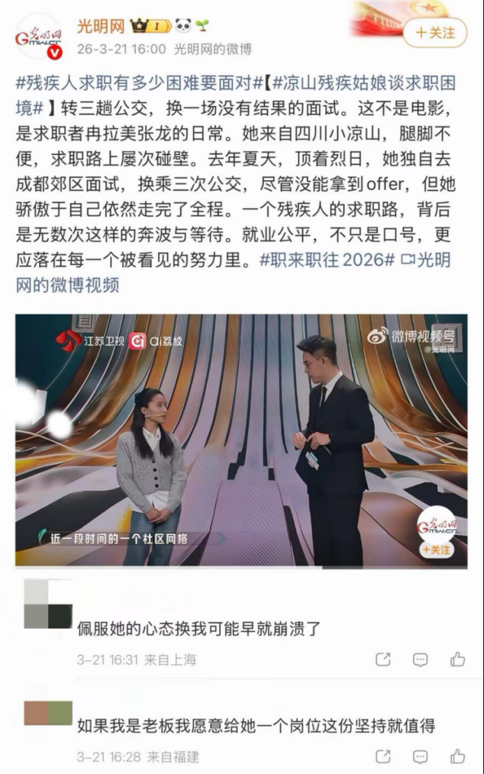 小冉的故事,只是无数普通求职者的一个缩影。她的坚韧,让我们看到了普通人面对生活坎坷时的力量;而舞台上、舞台外那些自发的帮扶与陪伴,让我们感受到了人与人之间最珍贵的善意。其实从来都不是谁照亮了谁,而是一份坚持被看见,一份善意被回应,便汇聚成了前行的光。