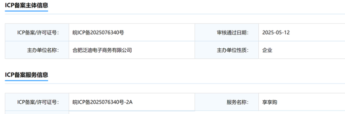 享享购的隐私协议显示,该App涉及的企业名称为合肥泛迪电子商务有限公司,该公司成立于2022年,其实控人为唐雪利。经ICP/IP地址/域名信息备案管理系统查询,享享购App审核通过日期为2025年5月12日。