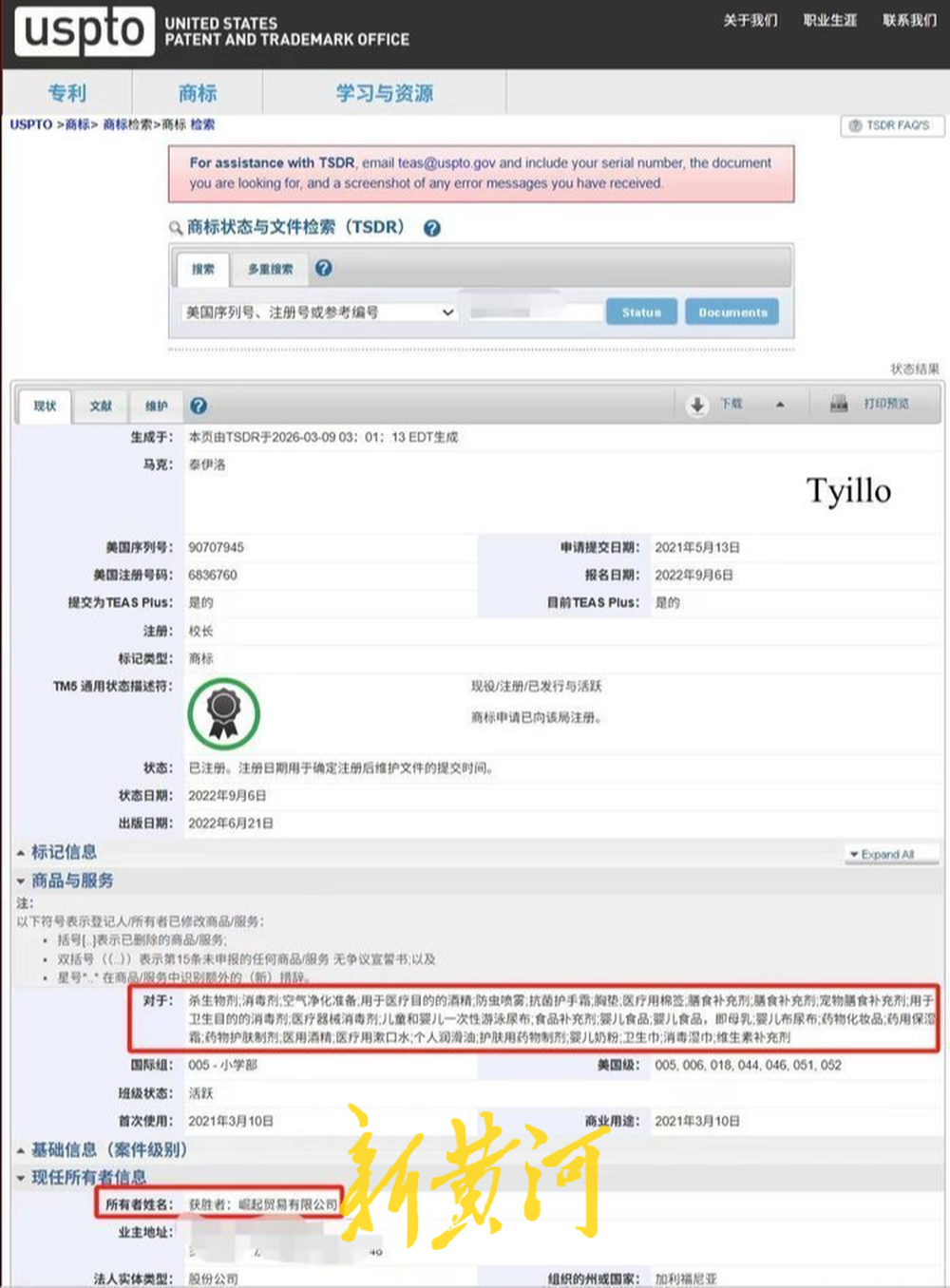 记者进一步查询世界知识产权组织(WIPO)数据库及美国专利商标局(USPTO)数据库发现,品牌“TYILLO”的商标同样归属于这家“崛起贸易有限公司”。同时,数据库律师/通信信息一栏显示,该品牌律师姓名为华人名字“LiWeng”,但根据美国专利商标局(USPTO)的规定,只有住所位于美国境外的申请人才必须委托美国执业律师代理其商标事务,如果商标申请人的主要营业地点或永久住所位于美国境内,则可以自行申请,无需律师代理。