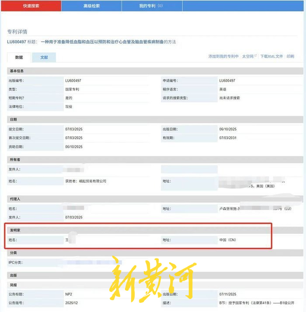记者在调查中发现,商家宣传的三个专利号——LU600995、LU601002、LU600497经查询显示,三项专利的发明人均为中国人。专利类型则是卢森堡形式审查专利,而这种专利制度仅对申请文件进行形式审查,不评估技术实质,含金量与经过实质审查的发明专利不可同日而语。记者注意到,专利所有人是一家名为“崛起贸易有限公司”的美国加州公司。