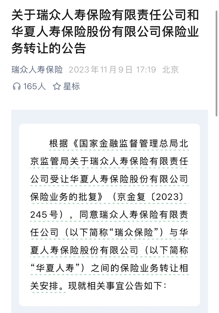 记者检索发现,早在2023年,“华夏人寿”的保险业务便已由“瑞众人寿”正式承接,相关转让事宜经国家金融监督管理总局北京监管局核准批复,并由两家公司联合发布公告公示。针对保单权利人的权益保障,公告中明确,本次转让后,瑞众人寿将承担相关保险业务的全部保险责任,华夏人寿原有投保人、被保险人、受益人无需更换保险合同,原合同继续有效,各项权益不受影响。