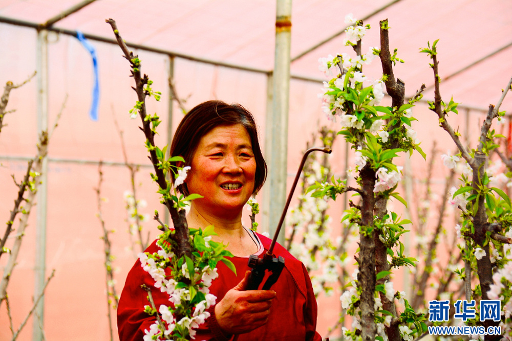 2月5日,种植户在山东省郯城县福林家庭农场温室大棚里给樱桃进行人工喷雾授粉。新华网发(张乐民 摄)