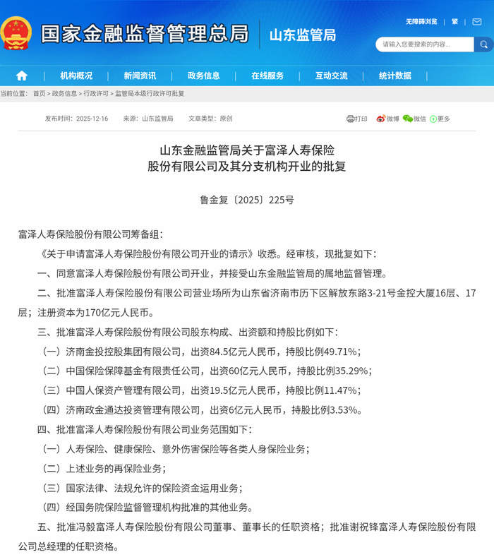 批复内容透露,富泽人寿股东结构呈现出“地方国资+行业保障基金+大型险企”的特点。