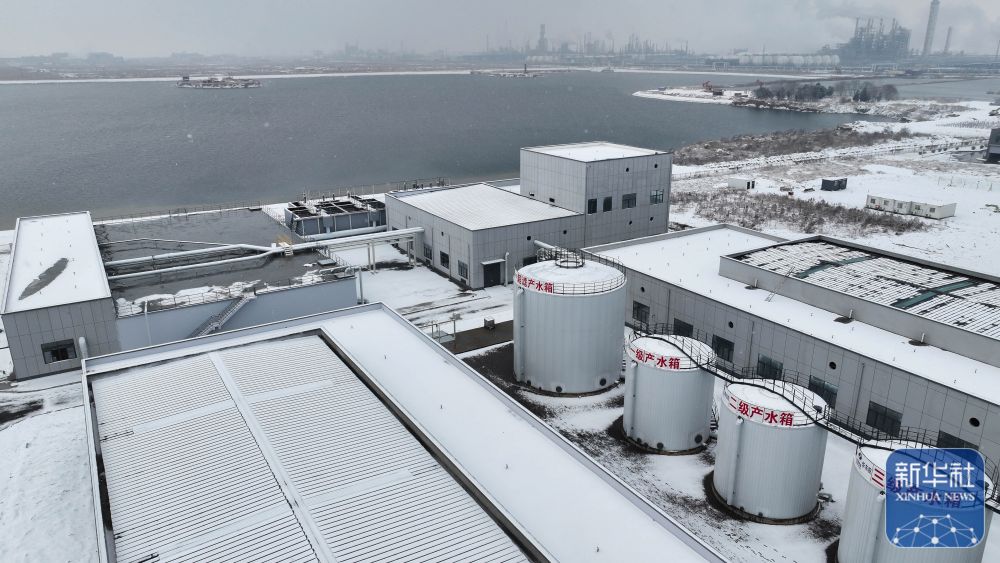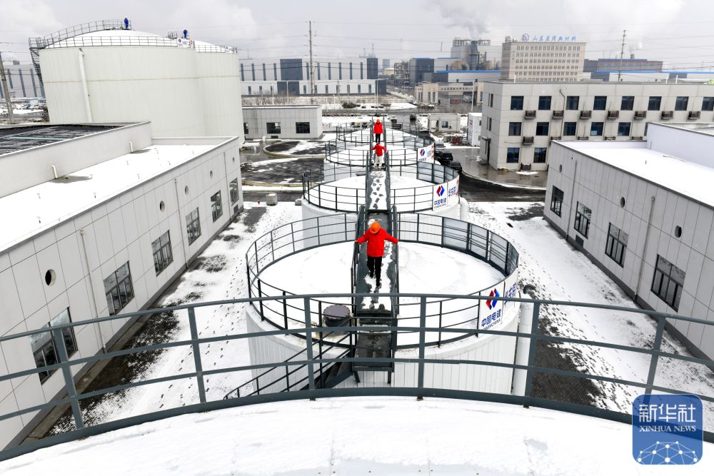3月6日,在山东省东营港中水回用项目,中国电建华东院的工作人员雪后巡查产水箱。