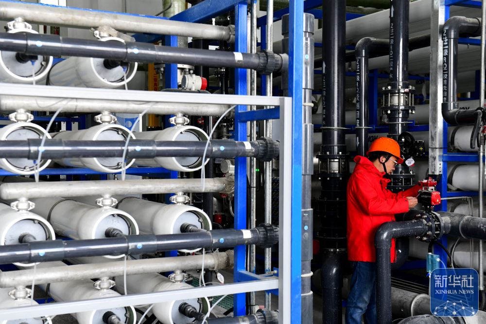 3月6日,在山东省东营港中水回用项目,中国电建华东院的工作人员巡查超滤装置。