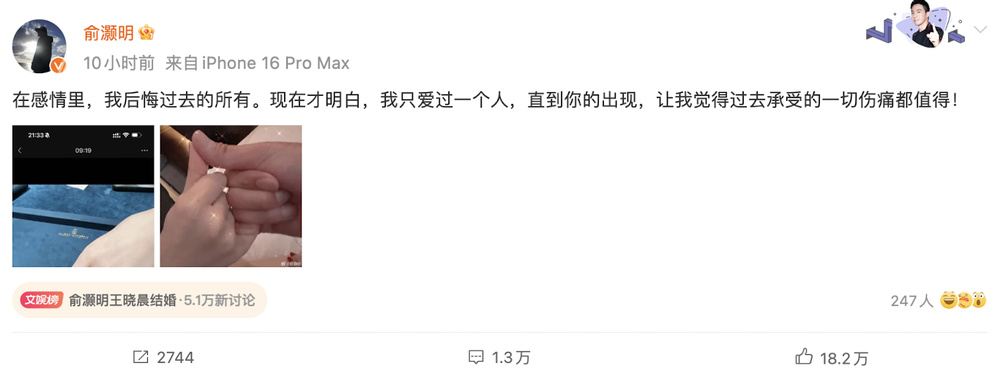 5月17日凌晨,37岁的俞灏明在个人社交媒体平台晒出钻戒及与王晓晨手拉手的照片,配文深情告白:“在感情里,我后悔过去的所有。现在才明白,我只爱过一个人,直到你的出现,让我觉得过去承受的一切伤痛都值得!”