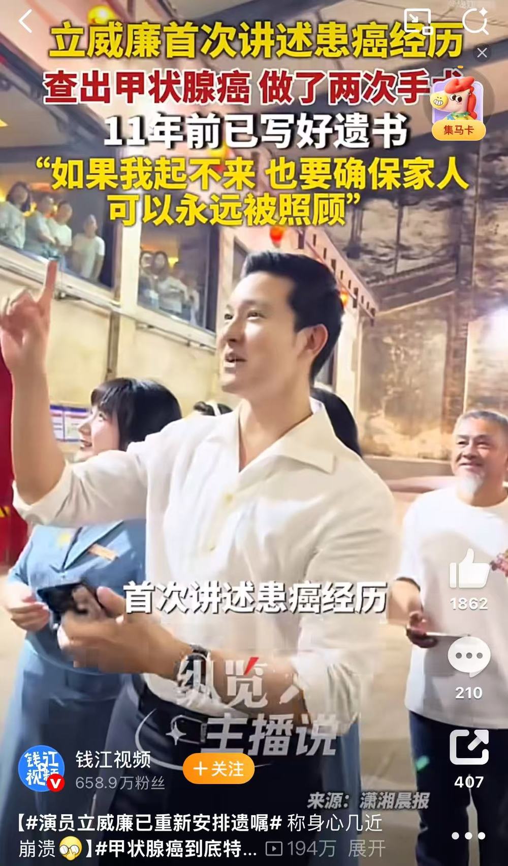 2025年12月8日,据媒体报道,演员立威廉在今年7、8月被诊断出甲状腺癌二期,9月已进行两次手术。