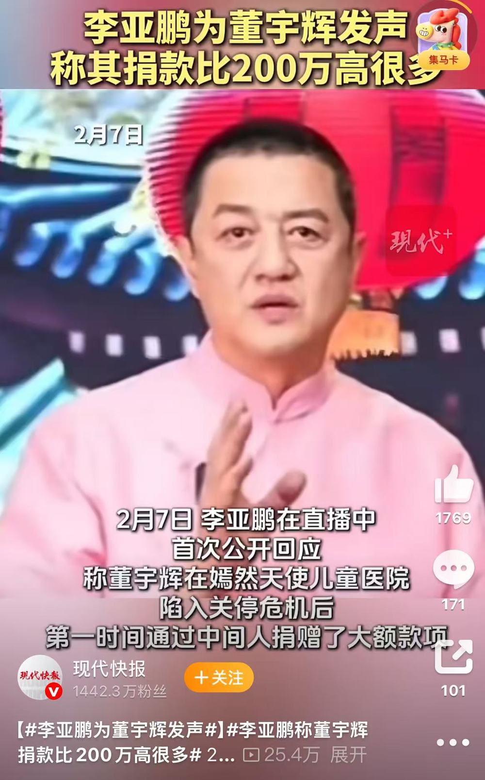 2月8日,李亚鹏加班开爱心专场,给为北京嫣然儿童医院捐款的企业带货,其中包括莲花味精、卫龙、豪士面包、茶口乐、霞湖世家等。第三方平台数据显示,李亚鹏8日晚的“承蒙厚爱感恩有你”主题直播持续了3小时33分,观看人次1684.2万,销售额7500万—1亿元。其中莲花味精一条链接商品就销量近25万单,销售额近500万元。