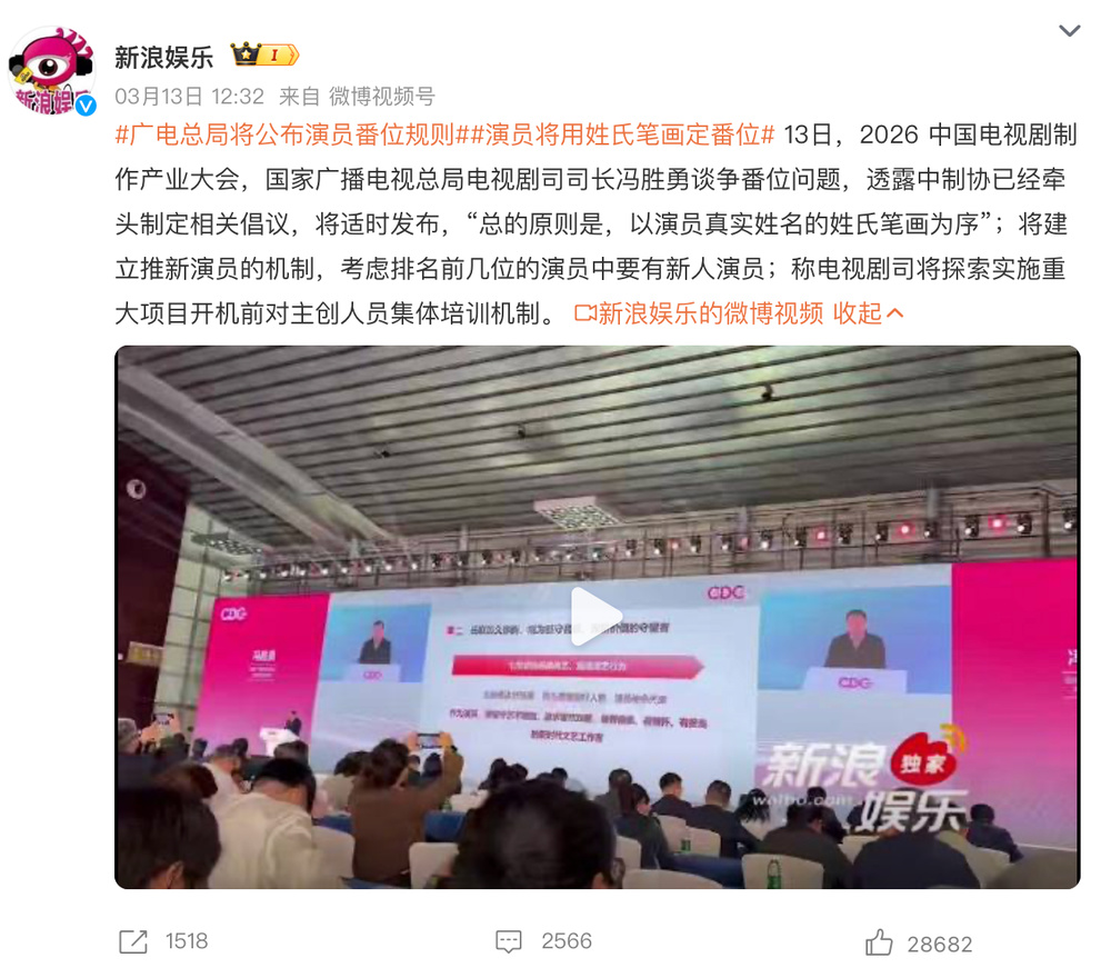 很快,3月13日,国家广播电视总局电视剧司司长冯胜勇在一行业大会上,明确谈到争番位问题,透露中制协已经牵头制定相关倡议,将适时发布。其中提到:演员署名以真实姓名的姓氏笔画为序,同时建立推新机制,主演阵容中必须纳入新人等。