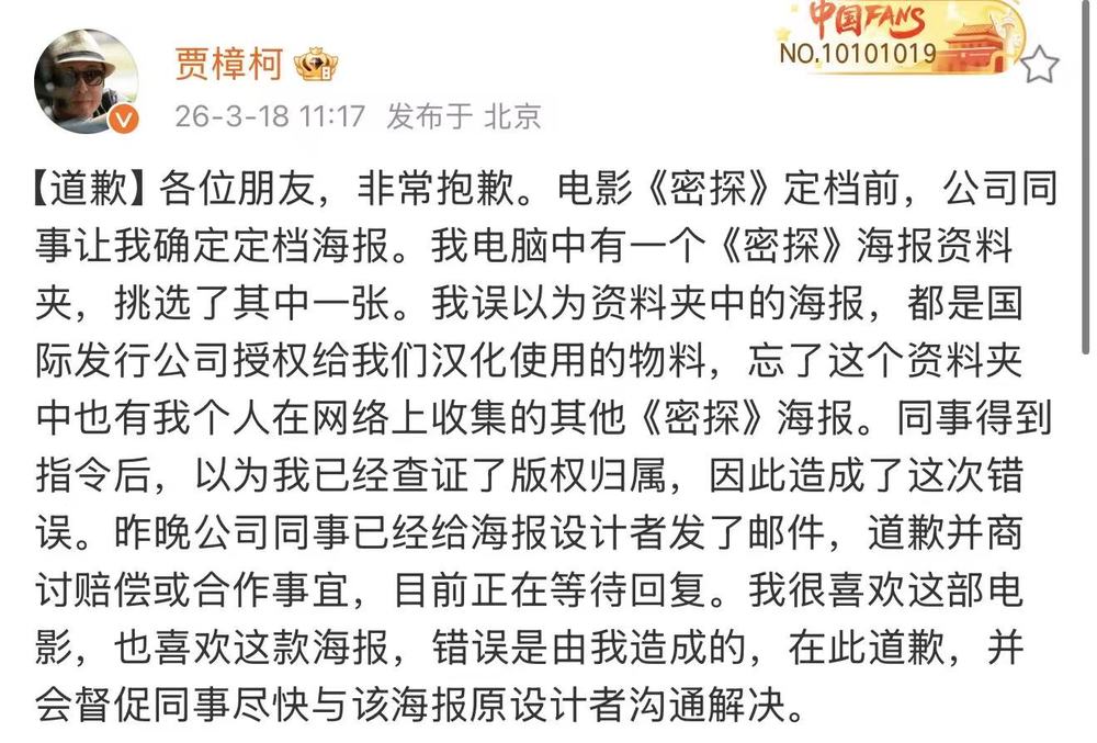 3月18日,贾樟柯就电影《密探》中国定档海报被曝侵权在社交平台公开道歉,称海报系误用,已联系原设计者沟通赔偿或合作事宜。