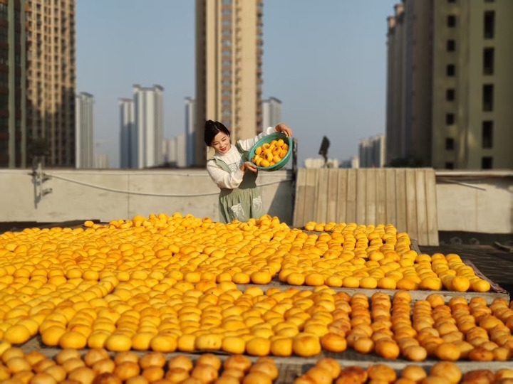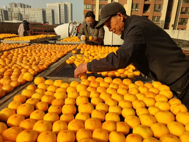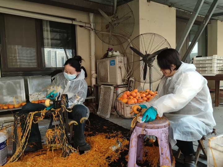 耿佰起的女儿耿晓燕左手扶柿、右手握机,随着“嗡嗡”的轻响,薄如蝉翼的柿皮顺着刀刃划出一道优美的弧线,落在一旁的竹筐里。“这旋皮的力道得拿捏准,皮太厚浪费果肉,太薄容易破,得练上小半年才能上手。”耿晓燕说,现在家里每天能加工两百多斤柿子,效率比父辈那时候提高了一倍,但“晾晒”这关键一步,依旧得靠天和耐心。