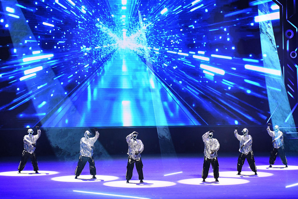 在开场节目《万马奔腾》中,20台机械臂与26台双臂机器人齐挥鼓槌,激昂鼓声奏出奋进节拍。