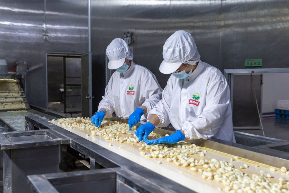 2025年5月1日,工人在位于山东省济宁市金乡县的山东鑫诺食品科技有限公司流水线上分拣大蒜。新华社发