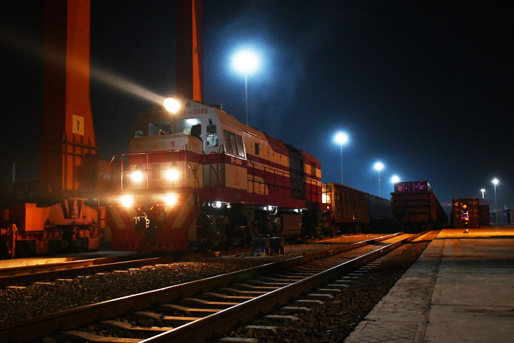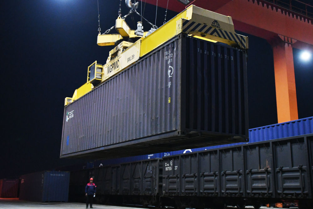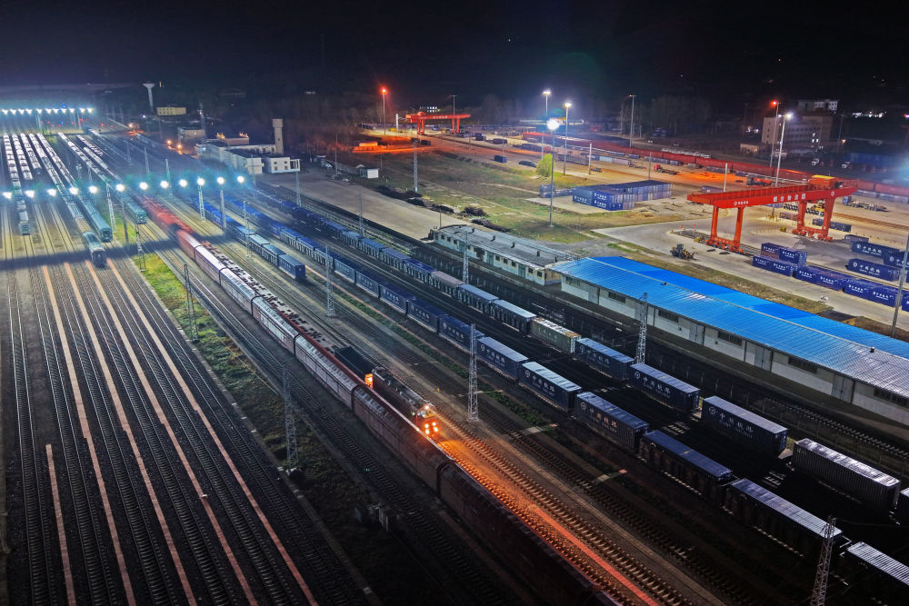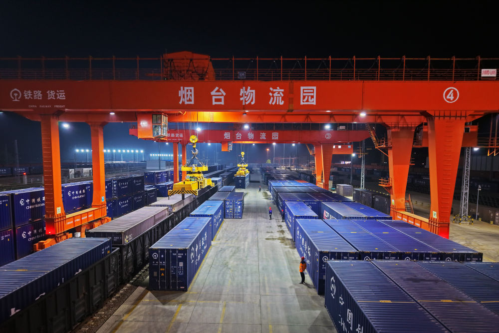 4月11日,烟台至广州铁路集装箱班列开行满一周年,发送化工、食品、机械设备等货物超21万吨。货物抵达广州后将分拨至港澳,为“山东制造”更好地融入粤港澳大湾区注入了强劲动能。新华社发(孙文潭 摄)