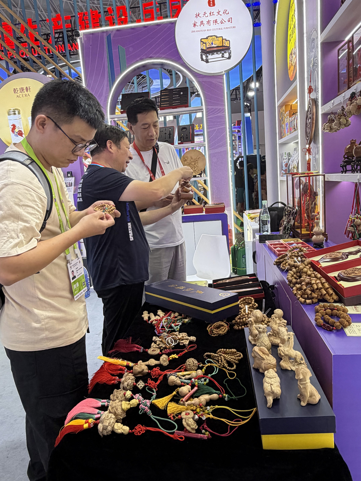 在程木匠桃木展位,一款“养生锤”成为现场的热门商品。外观精美,也突出实用性。程木匠创始人程银贵告诉记者,不少人是当作日常放松的小工具或伴手礼购买,由于现场库存有限,展位直接提供下单后发货的方式,也方便观众现场下单购买。