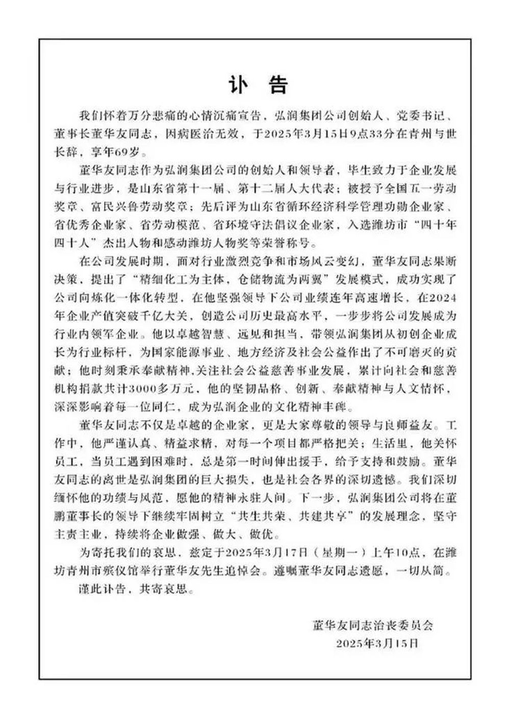 泰山财经获悉,潍坊最大民企弘润石化(潍坊)有限责任公司(下称弘润石化)董事长董华友因病医治无效,于2025年3月15日9点33分在青州逝世,享年65岁。