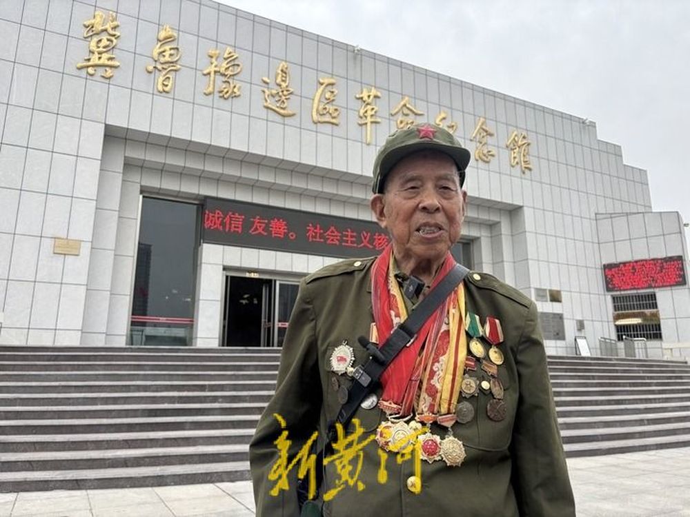 6月25日,冀鲁豫边区纪念馆大门外,一位满头银发、身穿军装的老人,被两位亲人搀扶着走了出来,他是98岁的菏泽籍抗战老兵李长生。