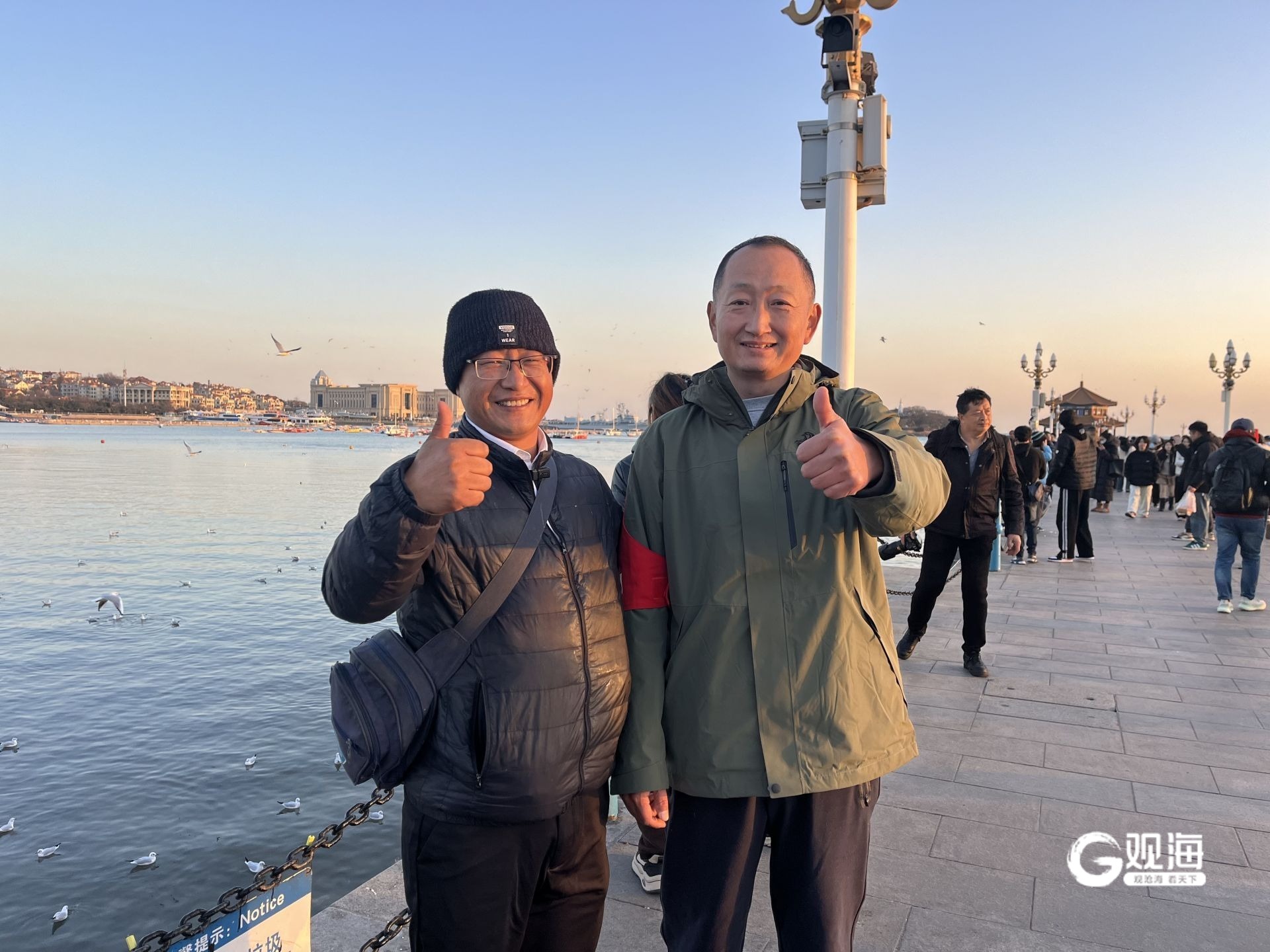 大雪时节,海风凛冽,海水刺骨,青岛进入一年当中最寒冷的阶段。12月8日上午,百年地标栈桥景区却因惊心动魄又感人至深的一幕奔涌着一股超越寒冬的暖流——一名男子落水,生命危在旦夕。危急关头,四道身影毫不犹豫地跃入冰海,一场与时间赛跑的生命救援迅速展开,最终落水者被成功托举上岸。记者辗转联系上其中两位施救者,一位是上岗仅4天、脱下军装不改本色的景区保安队长郭少臣,一位是常年在栈桥直播、被粉丝亲切称为“栈桥鸥爸”的热心市民李视昌。他们以凡人义举再次诠释了“好客山东”的温暖内核,为青岛这座城市的人间大爱写下最生动的注脚。
