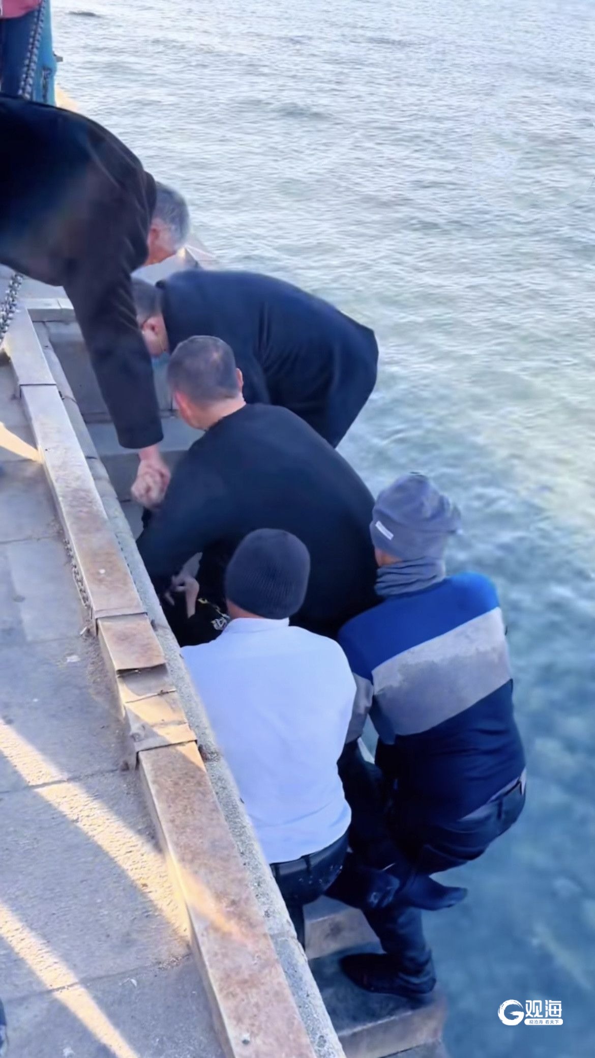 海水冰冷彻骨,呛冻得落水者昏迷不醒,也消耗着救援者的体力。“我游到时,感觉先下水的一位大哥有点体力不支了,因为他在水下待的时间长。”李视昌立即与另一位救援者架起落水者的胳膊,奋力向着栈桥台阶处移动。海水深及李视昌的胸口,落水者又身高体壮,这给救援带来了困难。“真是使出了九牛二虎之力。”他形容道。看到四位勇士将人托举上岸,栈桥上的市民、游客也自发形成了一条“生命接力链”,有人伸手搀扶水中的勇士,有人准备接应昏迷的落水者。大家默契配合,紧张有序。