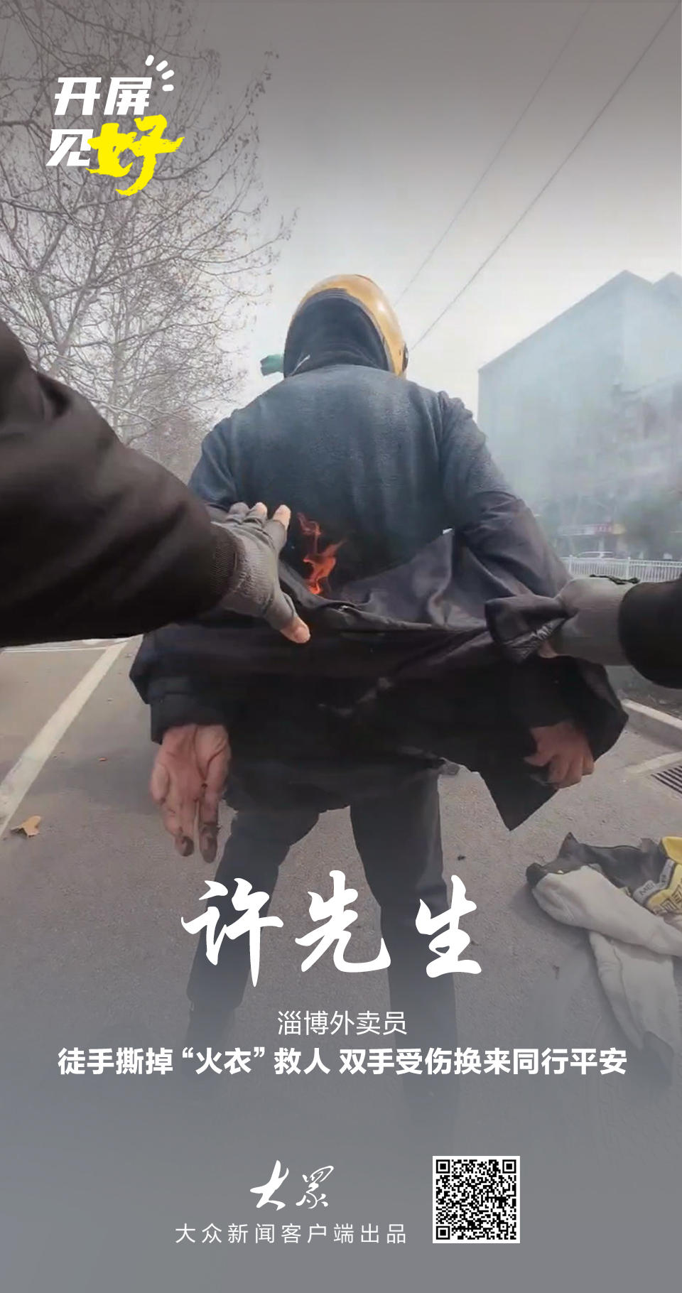 这位毫不犹豫冲上去的救人者,是淄博外卖员许先生。彼时他正前往周村,却偶遇了这危险一幕。面对已经被烧着的衣物,许先生没有片刻犹豫,徒手帮同行将着火的衣服一件件剥离身体。