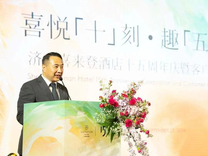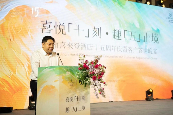 晚宴伊始,济南喜来登酒店业主公司济南文旅集团产业投资有限公司董事长伏建先生及酒店总经理李海荣先生分别致辞。酒店总经理李海荣先生深情回顾了酒店自创立以来经历的点点滴滴,从最初的默默无闻到如今成为业界标杆,每一步都凝聚着团队的智慧与汗水,更离不开每一位顾客的支持与厚爱。今晚,我们在此相聚,就是要表达酒店对业主公司、对客户最深的感激之情。