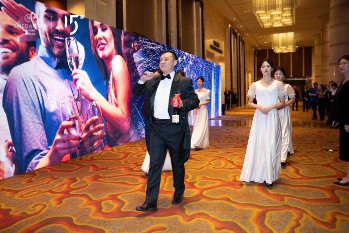 晚宴以一场震撼的马刀开香槟仪式拉开序幕。这一传统的仪式也是万豪集团旗下高端品牌瑞吉酒店的迎宾仪式。香槟喷涌而出,象征着胜利和喜悦的狂欢,宣告着这一美好时刻的到来。