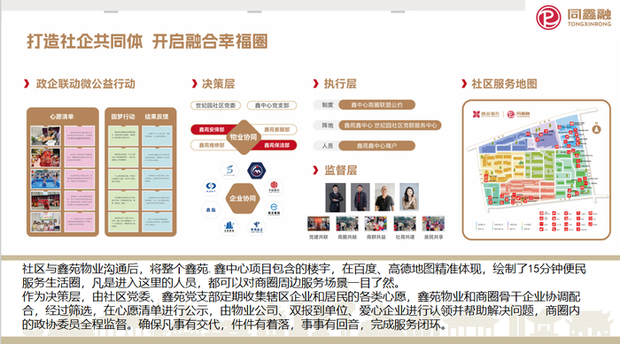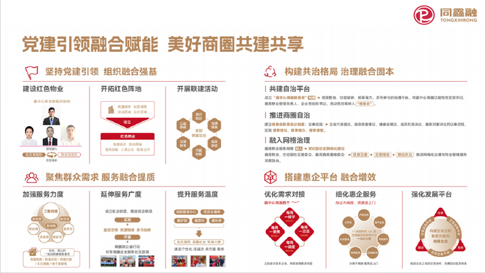在鑫苑·鑫中心商圈,东风街道世纪园社区党委创新打造政企联动“4+1+N”融合服务项目,即四融共建机制(组织融合、治理融合、服务融合、发展融合)、一体运转模式(政企联动运转模式)、N项服务内容(鑫连新、鑫安居、同鑫·营商沃土等),充分发挥商圈资源优势,带动整个商圈参与到社区基层治理中。