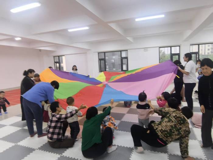 热身之后,丰富的亲子互动环节。活动以节奏互动《Gogogostop》《彩虹伞游戏》和《打起手鼓唱起歌》三个主题进行,孩子们以音乐会为灵感,在音乐的律动中欢快游戏,家长们则在一旁耐心陪伴,共度一段美好的亲子时光。
