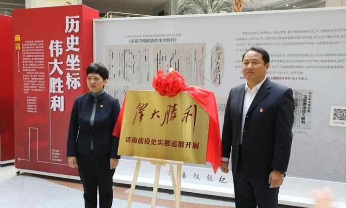 在全体师生的期盼中,商华、陈利伟共同为“伟大胜利”济南战役史实展揭幕,济南大学校团委书记李书翔、济南战役纪念馆副馆长王岩为志愿讲解员代表颁发“英雄山薪火”志愿者绶带,这不仅标志着馆校协同育人迈出坚实一步,更象征着红色精神在青年接力中薪火相传。