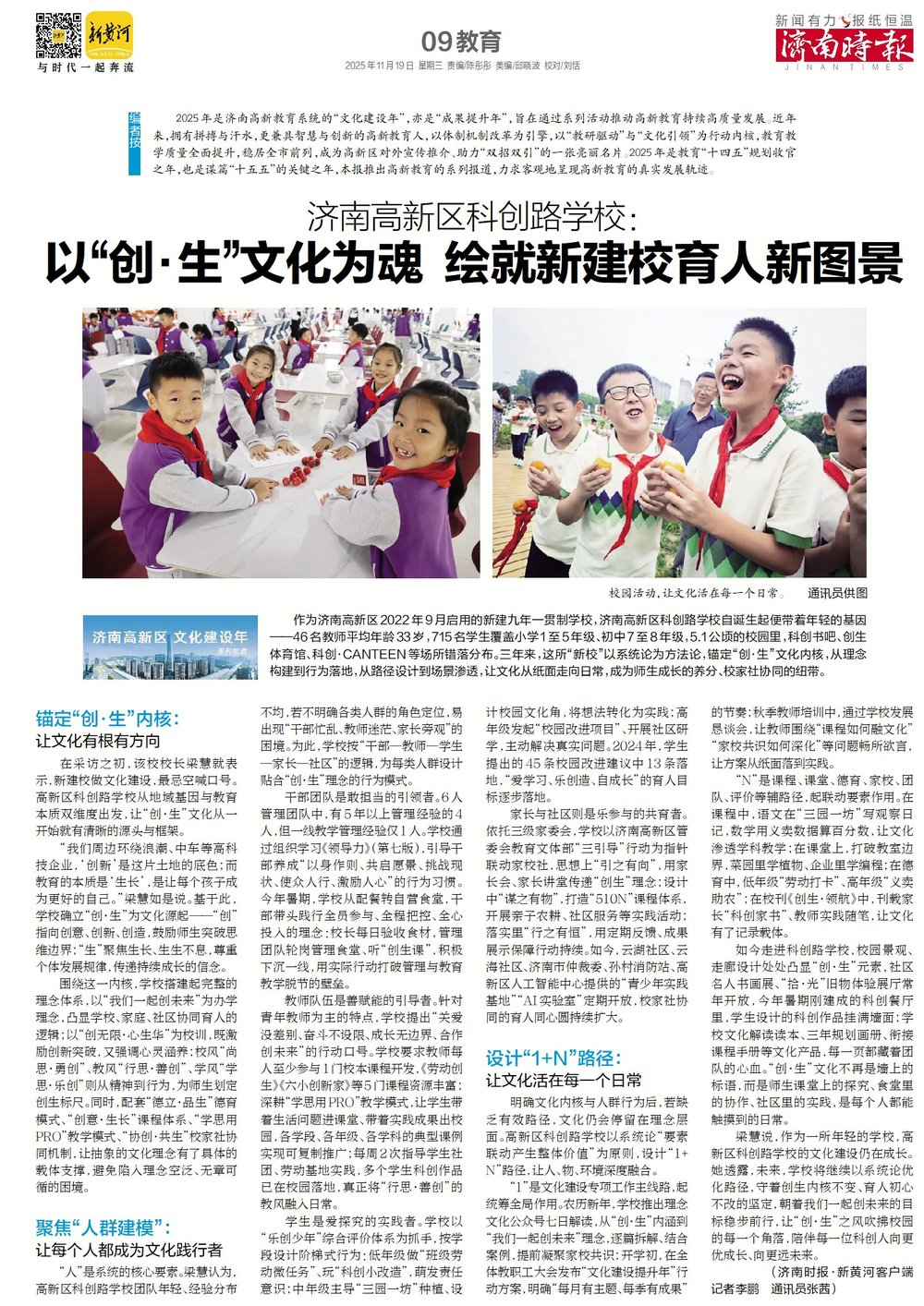 作为济南高新区2022年9月启用的新建九年一贯制学校,济南高新区科创路学校自诞生起便带着年轻的基因——46名教师平均年龄33岁,715名学生覆盖小学1至5年级、初中7至8年级,5.1公顷的校园里,科创书吧、创生体育馆、科创・CANTEEN等场所错落分布。三年来,这所“新校”以系统论为方法论,锚定“创・生”文化内核,从理念构建到行为落地,从路径设计到场景渗透,让文化从纸面走向日常,成为师生成长的养分、校家社协同的纽带。