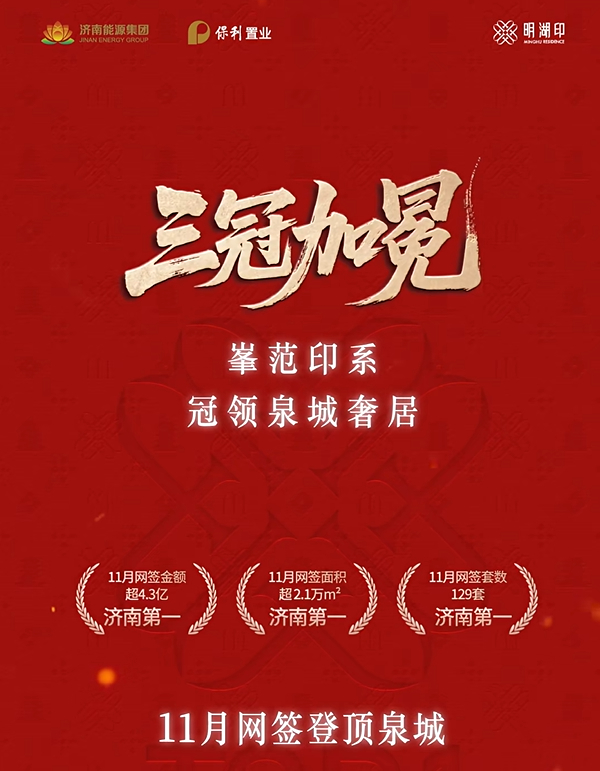 湖居标杆加冕三冠,首开即罄引爆改善市场。2025年,济南主城楼市迎来现象级热销。11月,济南能源集团与保利置业联手打造的明湖印项目,以首开即罄的热度摘得当月网签金额、面积、套数三项济南第一。作为大明湖片区近10年首宗住宅地块,距大明湖仅400米的稀缺湖居属性,叠加创新配置,让这个“时代孤本”成了层峯人群竞藏的焦点,也在主城宅地稀缺的背景下,以断层优势领燃泉城楼市。