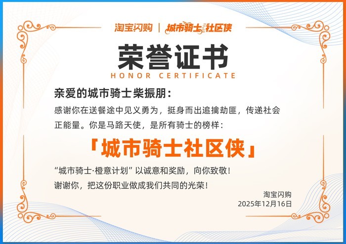 记者获悉,这名路过制服嫌疑人的外卖员,为淘宝闪购杭州的城市骑士柴振朋。12月15日晚,记者从淘宝闪购了解到,为表彰柴振朋见义勇为的行为,淘宝闪购对柴振朋给予“城市骑士·橙意计划”奖励,授予他“ 城市骑士社区侠”荣誉称号,以及1万元现金奖励。