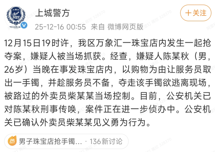 12月16日凌晨,杭州市上城警方发布通报称:“12月15日19时许,我区万象汇一珠宝店内发生一起抢夺案,嫌疑人被当场抓获。经查,嫌疑人陈某秋(男,26岁)当晚在事发珠宝店内,以购物为由让服务员取出一手镯,并趁服务员不备,夺走该手镯欲逃离现场,被路过的外卖员柴某某当场控制。”