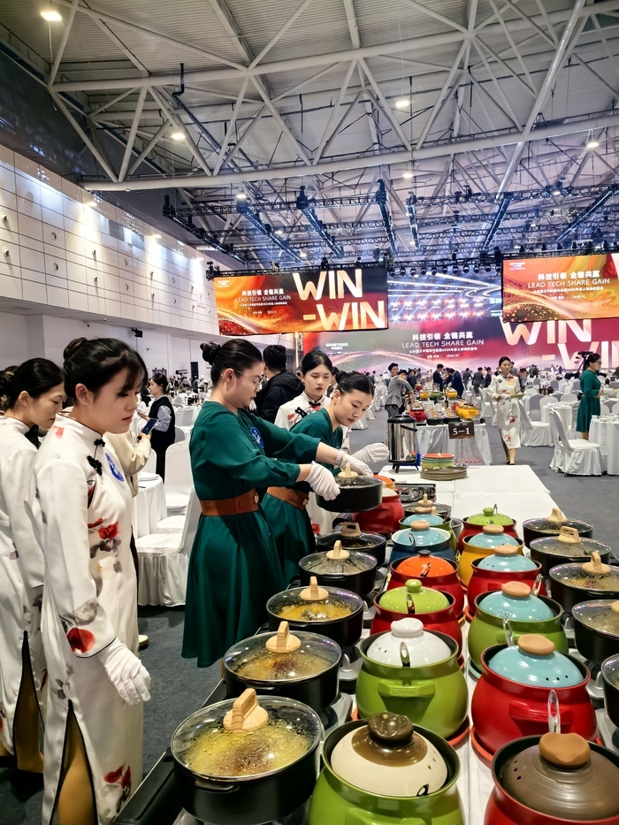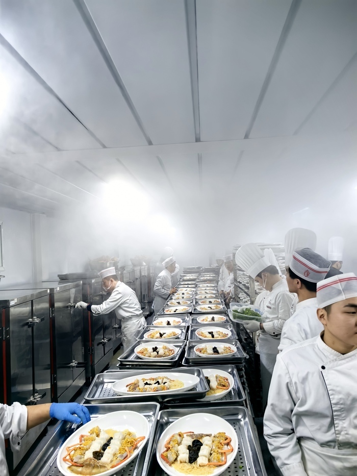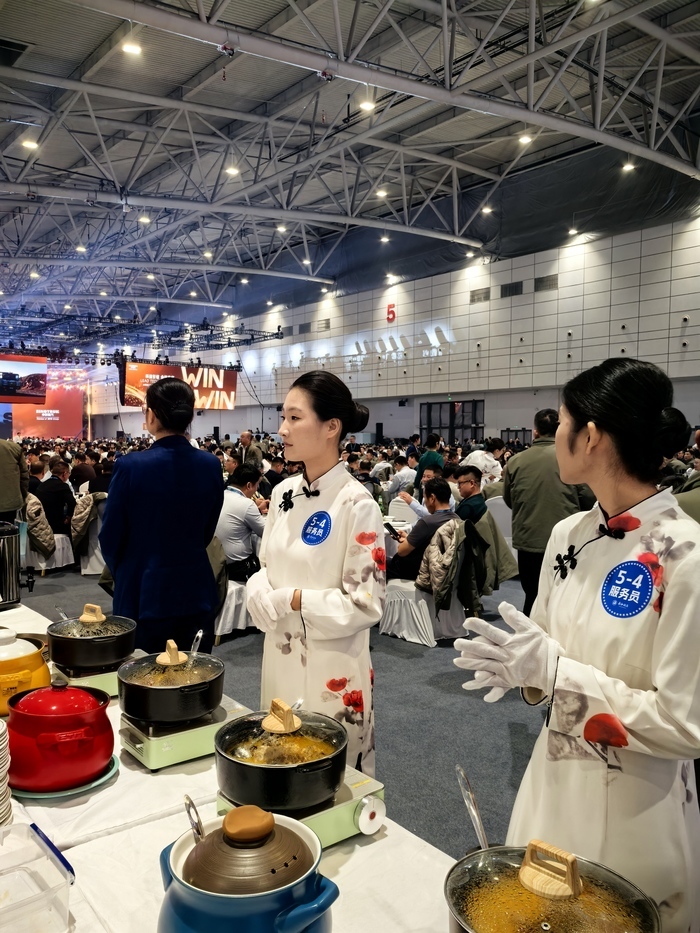 此次宴会举办场地为会展中心展厅,无厨房、保温房、凉菜间等基础餐饮配套,无供暖系统的环境叠加寒潮天气,给餐食制作、保温、安全管控及服务保障带来全方位难题。作为深耕餐饮酒店行业三十年、主导行业标准制定的领军者,任兴本凭借深厚的行业经验与资源整合能力亲自坐镇统筹调度,快速敲定“硬件先行、服务兜底、精准破局”的解决方案:紧急投入60余万元,专项采购并定制集装箱厨房、保温房、配电室等全套专业餐饮设施,严格对标食品安全与宴会服务标准,在空旷展厅内从零搭建起功能完备的临时餐饮作业体系;同步规划标准化烹饪动线,批量排布砂锅与炉灶保障汤汁持续滚沸,330余条鲜鱼按流程有序备蒸,仅用数日就完成“无到有、劣到优”的场地改造;12天内高效推进食材溯源、人员调配、流程演练等全环节筹备,更依托“情满舜和”的服务理念制定精细化服务方案,确保服务无死角、体验无短板。