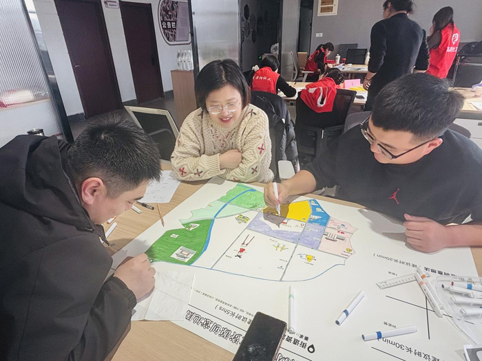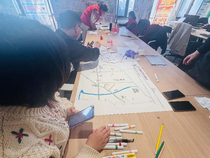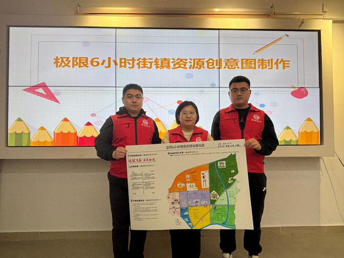 在6小时的极限任务中,团队分工明确、紧密协作:一人负责实地摸排,精准标记各类服务点位;一人系统整理信息,将百余项资源按“民生服务、产业支持、公益帮扶”归类建档;一人专注创意绘制,通过色彩与图示将资源信息转化为清晰易懂的视觉地图。团队成员反复核对、优化细节,在有限时间内将零散资源整合成一张系统化的服务网络。