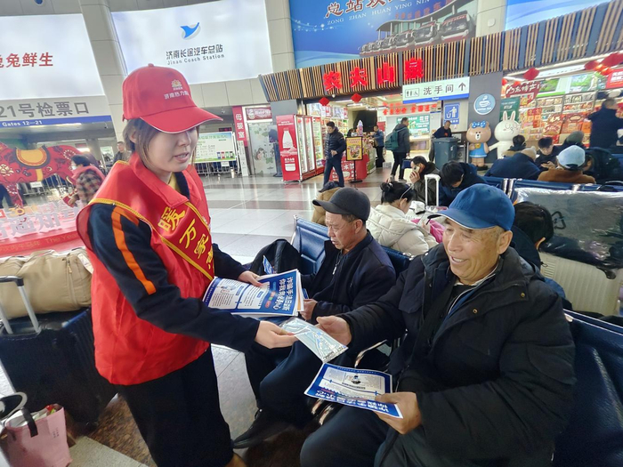 除服务引导外,志愿者们还在服务台旁设立便民站点,为旅客免费提供一次性口罩、热水、应急药品等物资,发放春运反诈宣传单页,普及乘车安全、防诈骗、防走失等知识,切实提升旅客安全出行意识,用“暖心”服务化解旅途疲惫,赢得了旅客们的广泛赞誉。