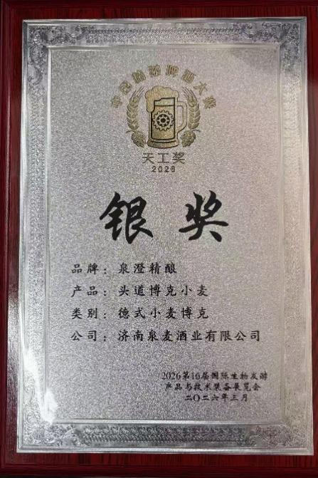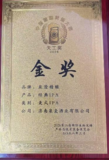 日前,在济南黄河国际会展中心闭幕的2026第16届国际生物发酵产品与技术装备展览会上,济南本土精酿品牌泉澄精酿凭借卓越的品质大放异彩,一举斩获展会重要奖项“天工奖”一金一银两项大奖,成为展会瞩目的焦点。