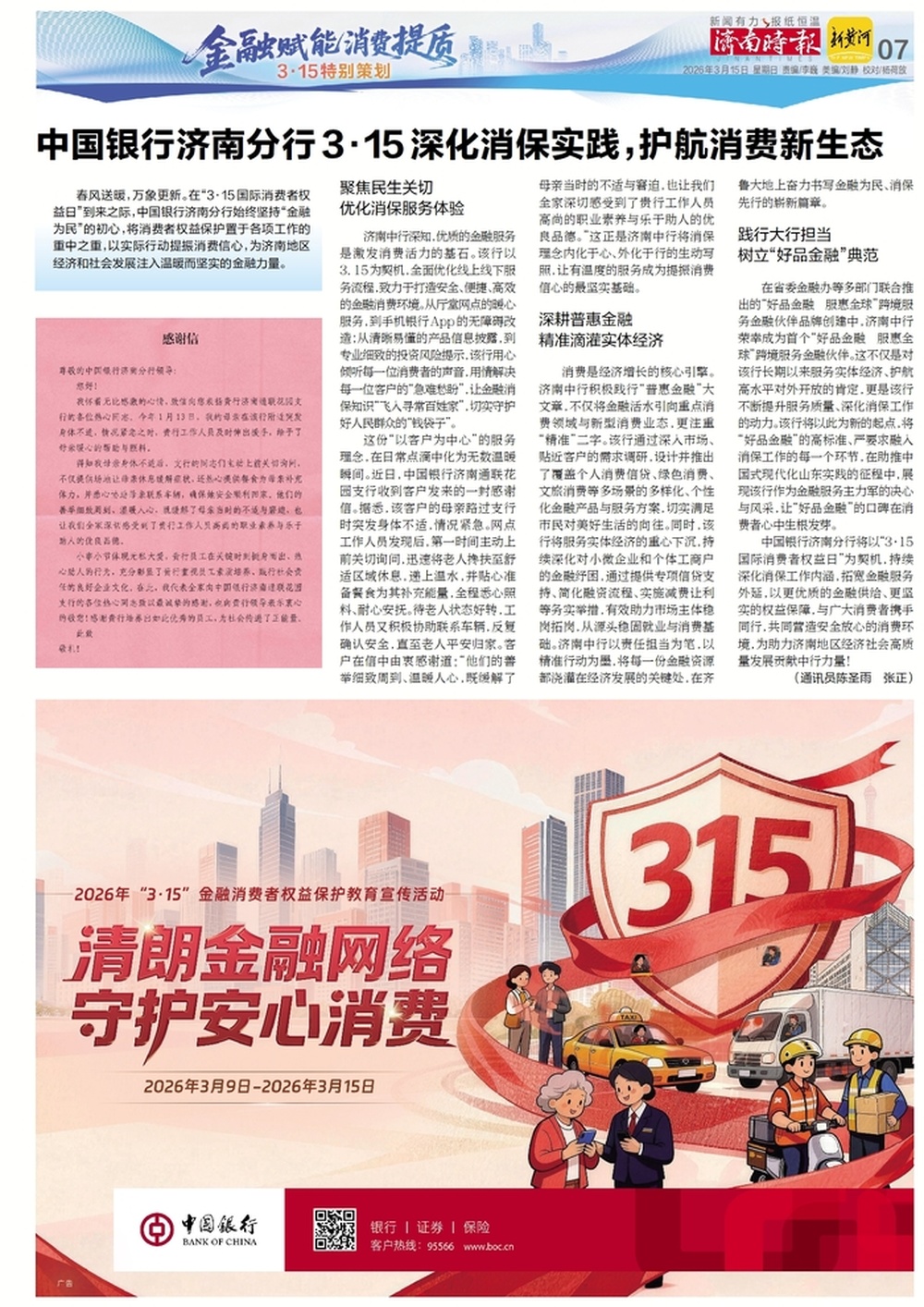 春风送暖,万象更新。在“3·15国际消费者权益日”到来之际,中国银行济南分行始终坚持“金融为民”的初心,将消费者权益保护置于各项工作的重中之重,以实际行动提振消费信心,为济南地区经济和社会发展注入温暖而坚实的金融力量。